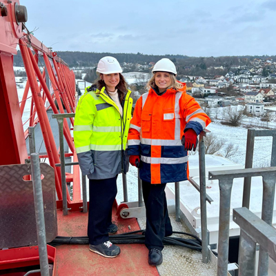wie es scheint, wollen zwei mitarberinnen offensichtlich eine fortbildung zur kranfahrerin in angriff nehmen.